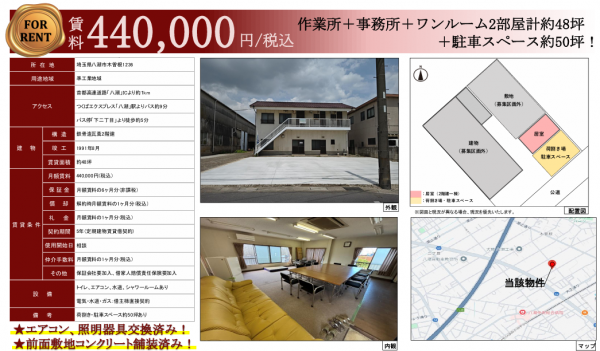 【賃貸物件のご紹介】埼玉・八潮 作業所兼事務所 コンクリート舗装済み荷捌きスペースあり